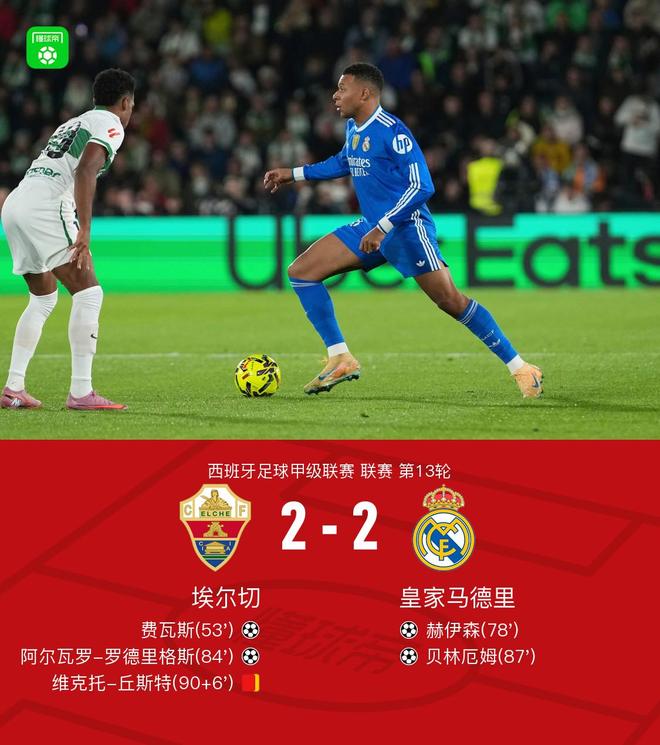 北京时间11月24日,西班牙足球甲级联赛第13轮比赛,埃尔切主场迎战皇家马德里。上半场两队都没有取得什么成绩。下半场,菲比斯首开纪录。贝林汉姆传中,休伊森追平。阿尔瓦罗的进球再次让主队取得领先,姆巴佩助攻再次追平贝林汉姆。全场比赛最后几分钟,皇马2-2战平埃尔切,结束了连续三场不胜的局面。重要比赛第53分钟,巴雷拉后脚跟助攻,费布斯破门。皇家马德里0-1。他在第80分钟打入扳平比分的进球。休伊森禁区内进球。皇家马德里 1-1。第85分钟,银河队再次陷入防守,阿尔瓦罗进球。进球,皇马1-2。第87分钟,姆巴佩将球扑出,贝林汉姆破门。皇马很快将比分追成2-2平。激动人心的时刻,两队球员都入场了。赫赛马上就要开始了。在第四分钟随后,罗德里戈从一定角度蹲下,将球射高出横梁。 7分钟时,镜头转向乐队。维尼修斯在替补席上等待着。第11分钟,阿森西奥传球。姆巴佩射门偏出。第17分钟,卡雷拉斯在防守区内被拦截。第22分钟,拉斐尔·米尔的射门被库尔图瓦挡出。阿诺德开出角球,劳尔·阿森西奥头球攻门偏出。第25分钟,古勒远射,但皮球稍稍高出。第29分钟,安德烈·席尔瓦与库尔图瓦一对一,选择传中,但射门偏出。第3分钟,姆巴佩获得机会,但最后一脚射门被佩纳挡出。第35分钟,阿诺德右路传中,姆巴佩的抽射再次被佩纳挡出。第48分钟,姆巴佩突破,罗德里戈射门被挡出。第53分钟,巴雷拉后脚跟助攻,法巴斯破门,皇马0-1。第58分钟,皇马替补登场e,维尼修斯和巴尔韦德替补上场。第73分钟,维尼修斯无私传球,但被主队挡出。第80分钟,后卫突破扳平比分。休伊森禁区内进球。皇家马德里 1-1。第79分钟,阿诺德传球,维尼修斯的射门击中门框。第85分钟,银河队再次陷入防守。阿尔瓦罗进球,皇马进球。马德里1-2 第87分钟,姆巴佩扑出皮球,贝林汉姆破门,皇马很快将比分追成2-2。第90+4分钟,卡马文加传球将球送到门前,但贡萨洛的铲射没有被踢出。更新了比赛报告详细信息...球队阵容技术统计