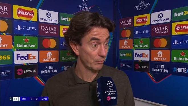 托特纳姆热刺队主教练托马斯·弗兰克在欧冠第四轮比赛中带领球队主场4-0战胜哥本哈根队后接受了TNT体育的采访。托马斯,很好的答案。这是您任期内最大的胜利,您怎么看?当然,我对很多事情都很满意。在生活和足球中,我认为在糟糕的表现或糟糕的情况之后,你的反应很重要。我们称之为“韧性”,在过去的两天里我看到我们的球员表现出了令人难以置信的韧性。他们想要扭转局面,拿出出色的表现,今天他们做到了,我们取得了非常非常好的胜利。这场胜利在很多方面都令人印象深刻。因为我认为比赛从一开始就完全在我们的掌控之中,直到我们2-0领先。之后我们得到了红牌,但球员们似乎找到了新的水平,他们非常令人印象深刻,我们又进了两个球,所以我很高兴。我认为球迷们做得很好并且从一开始就支持我们整个比赛的第一时刻。一切都很顺利。这些都是足球运动的起起落落。布伦南·约翰逊打进了他在欧冠的首个进球,但当他吃到红牌时,比分已经是2-0,比赛进行到了第56分钟。你认为这是不必要的铲球吗?你怎么认为?是的,你总是可以这么说。但当他在比赛最激烈的时候上场时,我认为他无意做任何可能导致红牌的事情。说实话,我还是觉得这个处罚还是蛮重的。如果只看静止图像的话,他看起来就像是在迈步,所以我认为他看起来更加凶猛。他基本上放下了脚并向我滑过来,让他看起来比实际情况要严肃得多。所以我不认为我做了什么鲁莽的事。就像你说的,当时的比赛可能很困难,但你的球队仍然找到了下一个水平,米奇·范德维恩的那个进球,我们是否看到了本赛季最好的进球?是的,那会我是我这个赛季的目标。毫无疑问。就好像梅西变成了中卫,米奇的动作让人惊叹。但这也激励了克里斯蒂安·罗梅罗,他在前锋位置上似乎也处于助攻位置……好吧,他不想输给中卫搭档。不,这也是一个非常好的目标。你是否觉得今晚的比赛让你对这支球队有了我们以前从未见过的新视角,也许是在韧性和韧性方面?绝对地。我喜欢的是每支球队都必须从糟糕的时刻中恢复过来,每支英超球队都有自己的时刻。这完全取决于你如何处理它,我对你的回应感到非常满意。我并不感到惊讶,但我很高兴看到这个小事情,但在周六的表现之后,这种情况发生了,很高兴看到球员们的反应、表现、努力提高和前进。正如你所说,对于球迷来说这是一个美好的夜晚。本周末英超主场对阵曼奇的比赛你准备好了吗?酯联?是的,就像我说的,享受24小时的胜利,然后完全专注于主场对阵曼联的比赛。他们也将是一个强大的对手,但我们已经做好了准备。 【咪咕独家观看英超联赛】
