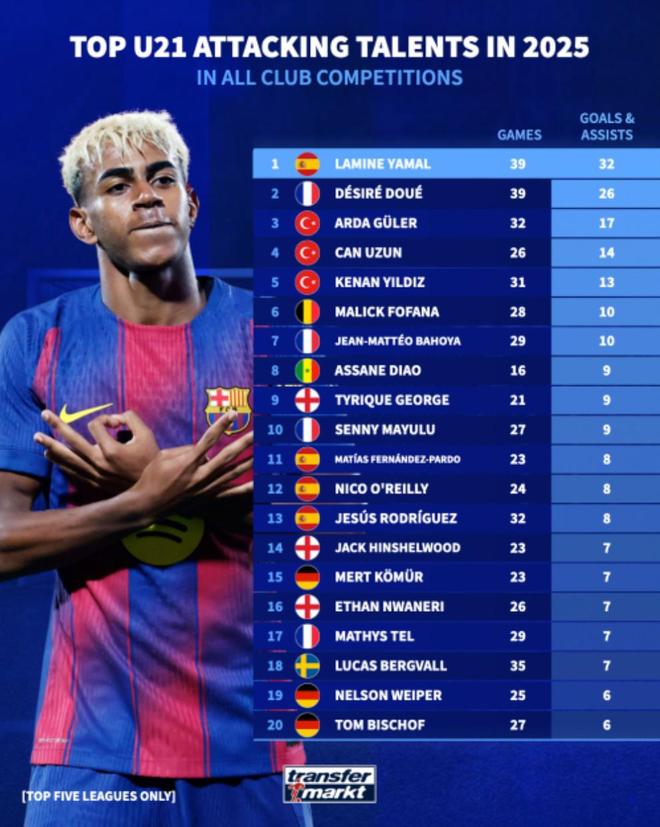北京时间10月11日,周德编制了2025年至今欧洲五大联赛各项赛事中直接贡献进球的前20名21岁以下球员名单。亚马尔在 39 场直接出场中攻入 32 粒进球排名第一,杜埃排名第二,古勒排名第三。 2025年5大联赛所有比赛中21岁以下球员进球数排名前20位: 1. 亚马尔(西班牙/巴塞罗那) 39场比赛32球 2. Due(法国/巴黎圣日耳曼) 39场比赛26球 3. 古勒(土耳其/皇家马德里) 32场比赛17球 4. Can Uzun(土耳其/法兰克福) 26 场比赛 14 粒进球 5. 凯南·耶尔迪兹 (土耳其/尤文图斯)31场比赛13个进球 6.马利克·福法纳(比利时/里昂)28场比赛10个进球 7.巴霍亚(法国/法兰克福)29场比赛10个进球 8.阿桑·迪奥(塞内加尔/科莫)16场比赛9个进球 9.蒂利克·乔治(英格兰/切尔西)21场比赛9个进球10.迈尔(法国/巴黎圣日耳曼)27场9球 11. 费尔南德斯·帕尔多 (西班牙/里尔) 23 场比赛打进 8 球 12. 尼科·奥莱利 (英格兰)曼城) 24场比赛进8球 13. 赫苏斯·罗德里格斯 (西班牙/科莫) 32场比赛进8球 14. 欣谢尔伍德 (英格兰/布莱顿) 23场比赛进7球 15. 科米尔 (德国/奥格斯堡) 23场比赛进7球 16. 恩瓦内里 (英格兰/阿森纳) 26场比赛进7球17. 马蒂斯·泰尔(法国/托特纳姆热刺) 7 粒进球 29场比赛 18. 卢卡斯·贝利瓦尔(瑞典/托特纳姆热刺) 35场比赛进7球 19. Viper(德国/美因茨) 25场比赛进6球 20. 比肖夫(德国/拜仁慕尼黑) 27场比赛进6球 【咪咕独家观看英超】