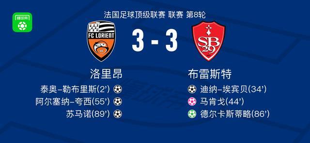 北京时间10月19日,法国足球甲级联赛第八轮开始。洛里昂主场迎战布雷斯特。比赛一开始,当地人凭借阿尔塞纳·库阿西的助攻和西奥·勒布里斯的进球取得领先。第34分钟,布雷斯特进攻有效,洛科凭借迪娜·埃宾贝助攻扳平比分。上半场快结束时,马肯戈意外将球打进自家球门,布雷斯特取得领先。换边再战,特奥·勒布里斯送出精准传球,阿尔塞纳·库阿西冷静破门,洛里昂再次扳平比分。第86分钟,布雷斯特获得点球机会。德尔卡斯蒂略主罚命中,客队第三次领先。关键时刻,班巴·迪昂在最后几分钟送出助攻,让苏马诺在门前再得一分,洛里昂扳平比分。赛后,两队握手言和,比分3-3。亮点 两分钟我比赛开始后,洛里昂队的库阿西助攻泰奥·勒布里斯攻入一球。第34分钟,布雷斯特队洛科助攻迪纳·埃宾贝破门。第44分钟,洛里昂队马肯戈打进乌龙球。第55分钟,洛里昂球员西奥·勒布里斯助攻阿尔塞纳·库阿西进球。第86分钟,布雷斯特队的德尔卡斯蒂略主罚点球。第89分钟,洛里昂队班巴迪昂助攻苏马诺破门。技术统计
