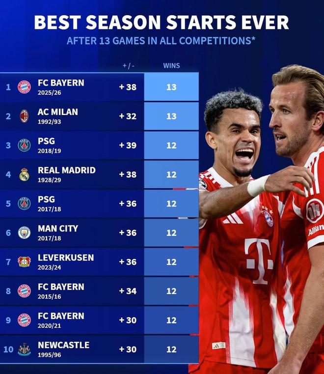 北京时间10月28日,德州人打完一个赛季各项赛事的前13场比赛,成为欧洲五大联赛球队历史上首发前10名的球队之一。本赛季,拜仁慕尼黑取得13场胜利,以38分的领先优势,超越1992-93赛季的AC米兰,取得领先地位。根据德国转会统计,五支大联盟球队13场比赛后历史前10名首发球员如下: 1.拜仁慕尼黑(2025-26赛季)13胜,38个净胜球 2.AC米兰(1992-93赛季)13胜,32个净胜球 3.巴黎圣日耳曼(2018-19赛季)12胜,39个净胜球 4.皇家马德里(1928-29赛季) 12胜,38个净胜球 5.巴黎圣日耳曼(2017-18赛季)12胜,36个净胜球6.曼城(2017-18赛季)12胜,36个净胜球7.勒沃库森(2023-24赛季)12胜,36个净胜球8.拜仁慕尼黑(2015-16赛季)12胜,34个净胜球9.拜仁慕尼黑 (2020-21赛季)12胜30个净胜球10.纽卡斯尔联(1995-96赛季)12胜30个净胜球【咪咕独家观看英超】